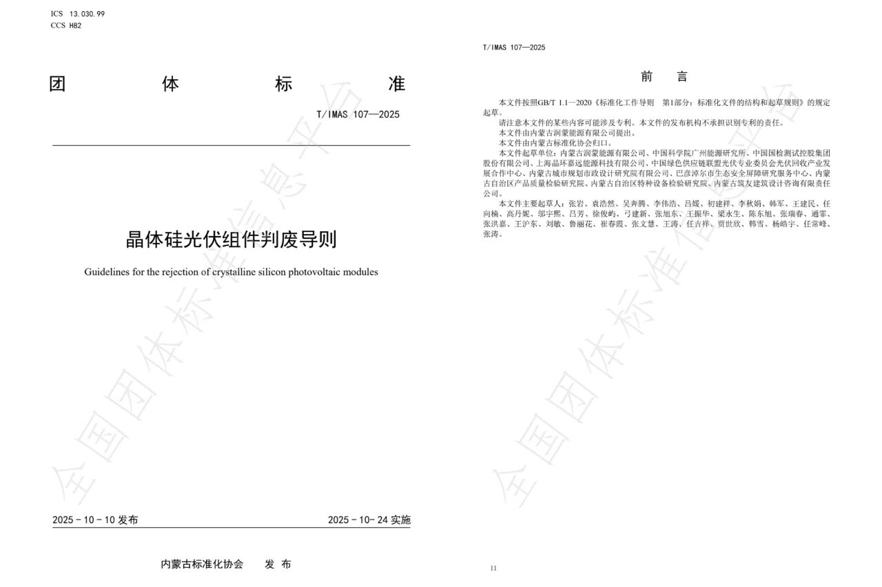 近日,由内蒙古润蒙能源有限公司(以下简称“润蒙公司”)作为主要起草单位参与编制的《晶体硅光伏组件判废导则 》《晶体硅光伏组件回收处理方法——热解法》两项团体标准,已于2025年10月10日正式发布。