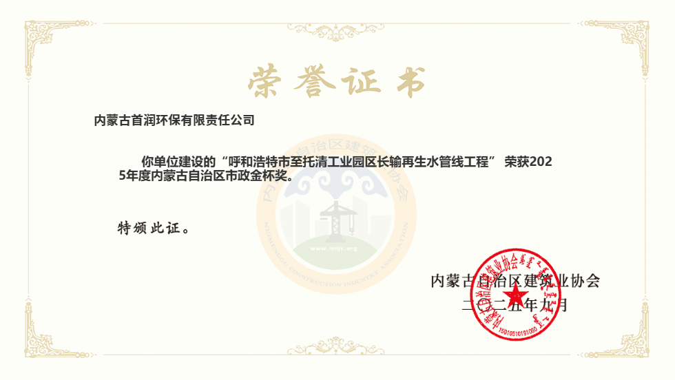 近日,内蒙古首润环保有限责任公司建设的“呼和浩特市至托清工业园区长输再生水管线工程”荣获2025年度内蒙古自治区市政金杯奖。这项殊荣的获得,标志着该项目以安全、进度、质量三大标杆,树立了自治区市政工程的全新典范。